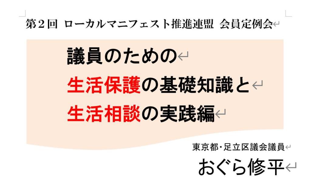 報告者は、LM会員の小椋修平 足立区議会議員です。首都圏を中心に貧困問題に取り組む自治体議員ネットワーク「コロナ災害対策自治体議員の会」共同代表をつとめ、職も住まいも失った人々の支援に取り組んでいます。マニフェスト大賞では「生活保護の扶養照会の改善」で最優秀政策提言賞、「生活保護のしおりの扶養照会に関する記載の調査と改善」で最優秀成果賞を受賞しました。今回は生活保護の初歩の基礎と議員として何ができるのかについて、実例を通して報告いただきました。