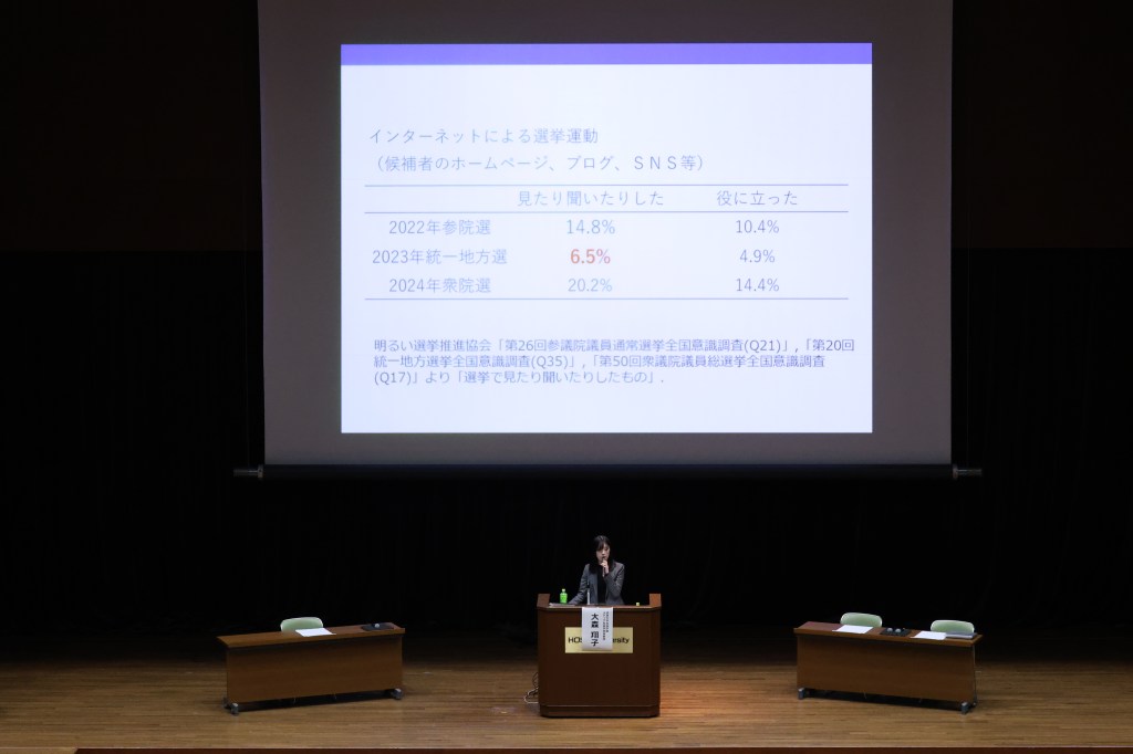 さらに、大森翔子 法政大学社会学部メディア社会学科准教授が「SNSが有権者に与える影響」と題した発表を行いました。大森准教授は「SNSで接する政治情報は『偶然的で断片的』なもの」としたうえで、「健全な地方政治参加・民主主義に資するためには、リアルでの双方向の対話を継続できるかが鍵」だと述べました。