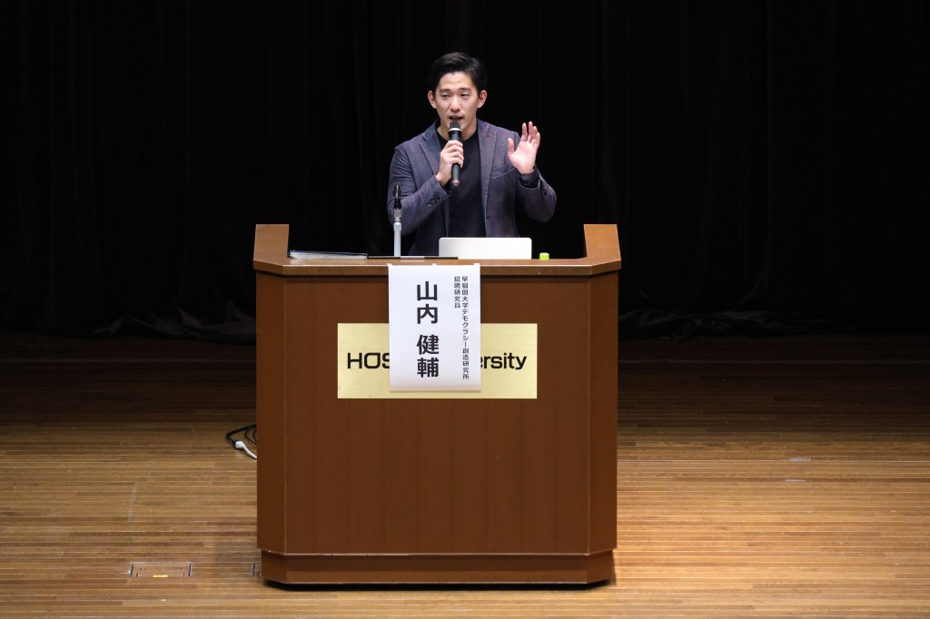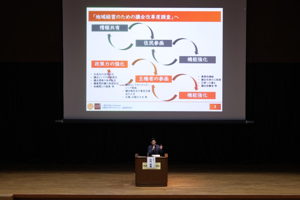 最後に「議会改革のトレンドと注目議会 ~地域経営のための議会改革度調査から~」と題して、早稲田大学デモクラシー創造研究所招聘研究員の山内健輔氏が発表を行いました。山内氏は「できることからTTP(徹底的にパクる)」を提案しながら、議会における生成AIの活用状況、シティズンシップの推進、議会報告会の工夫などについて現状と課題の報告を行いました。