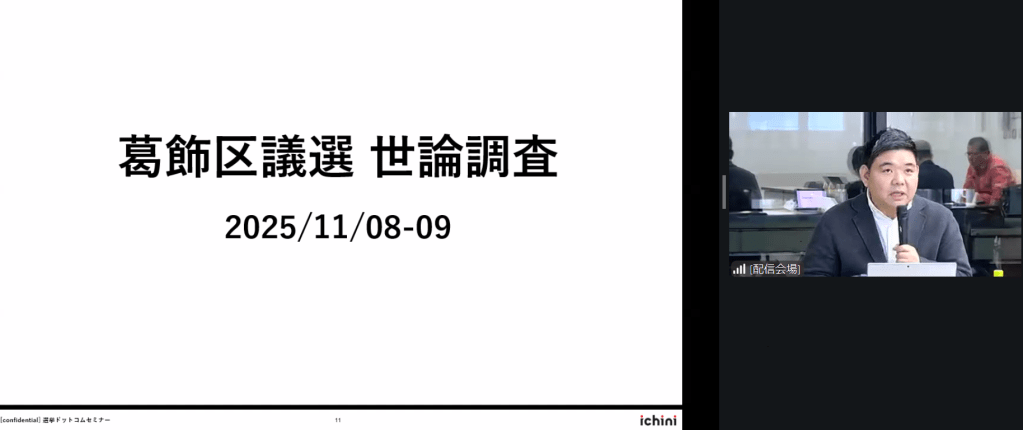 最後に、イチニ株式会社(選挙ドットコム)代表取締役の高畑卓氏から「AIを活用したネット広報ブログ・動画の作り方」と題した発表がありました。市民が参考にするメディアはテレビよりもネットである現状を伝え、民間企業を運営する立場で、広報・マーケティングの視点からのお話がありました。有権者や市民がふだん何を見ているのか、投票の時に何を参考しているのか。最近の国政選挙や葛飾区議会議員選挙を例えにした解説も。そして、AIを活用したブログの下書きや検索エンジン対策、SNS拡散方法なども紹介。〇〇地域の議員として、ターゲットを明確にした政策の打ち出し方について具体的な活用法を示しました。また「動画は質より量」としてAIで動画の構成案を作成する提案もありました。
