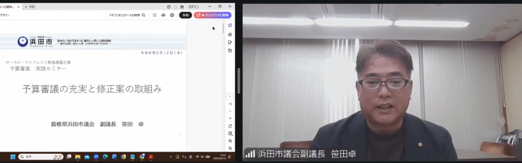 2026年2月12日(木)「予算審査 実践セミナー ~先進議会と学ぶ住民福祉のための予算審査~」をオンラインにて開催しました。今回は、各議会が予算審査をより実効性のあるものへと充実させていくことを目的に、3つの先進議会に登壇いただき、実践例を交えながら議論を行いました。突然の衆議院解散と総選挙後で忙しくされている方も多いなか、全国から総勢60名の参加がありました。