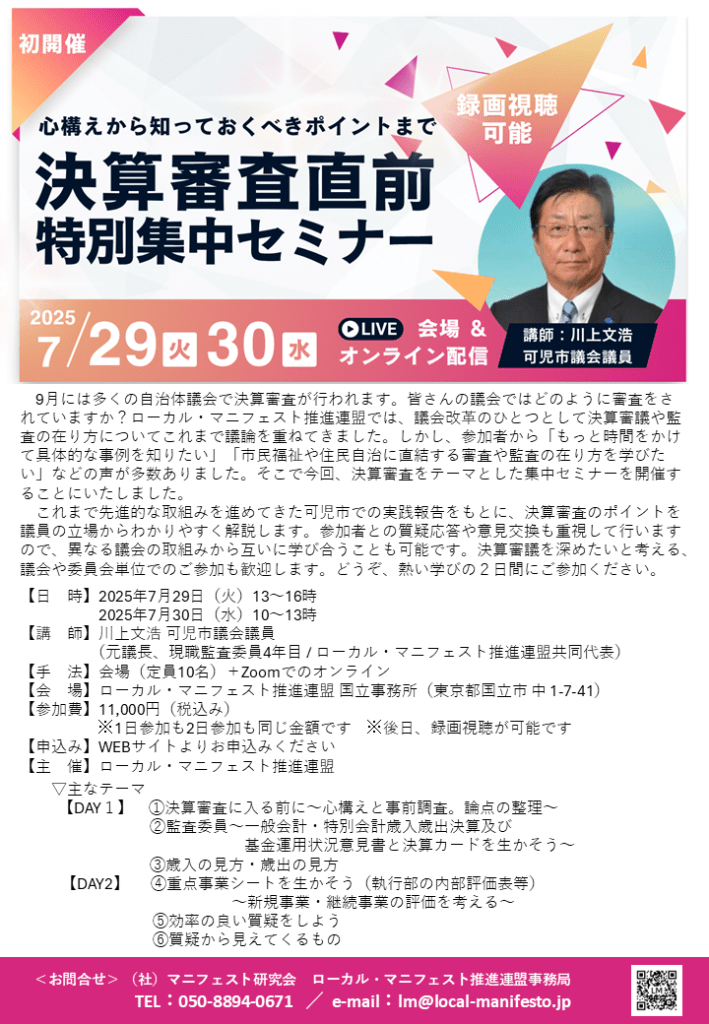 9月には多くの自治体議会で決算審査が行われます。皆さんの議会ではどのように審査をされていますか?ローカル・マニフェスト推進連盟では、議会改革のひとつとして決算審議や監査の在り方についてこれまで議論を重ねてきました。しかし、参加者から「もっと時間をかけて具体的な事例を知りたい」「市民福祉や住民自治に直結する審査や監査の在り方を学びたい」などの声が多数ありました。そこで今回、決算審査をテーマとした集中セミナーを開催することにいたしました。